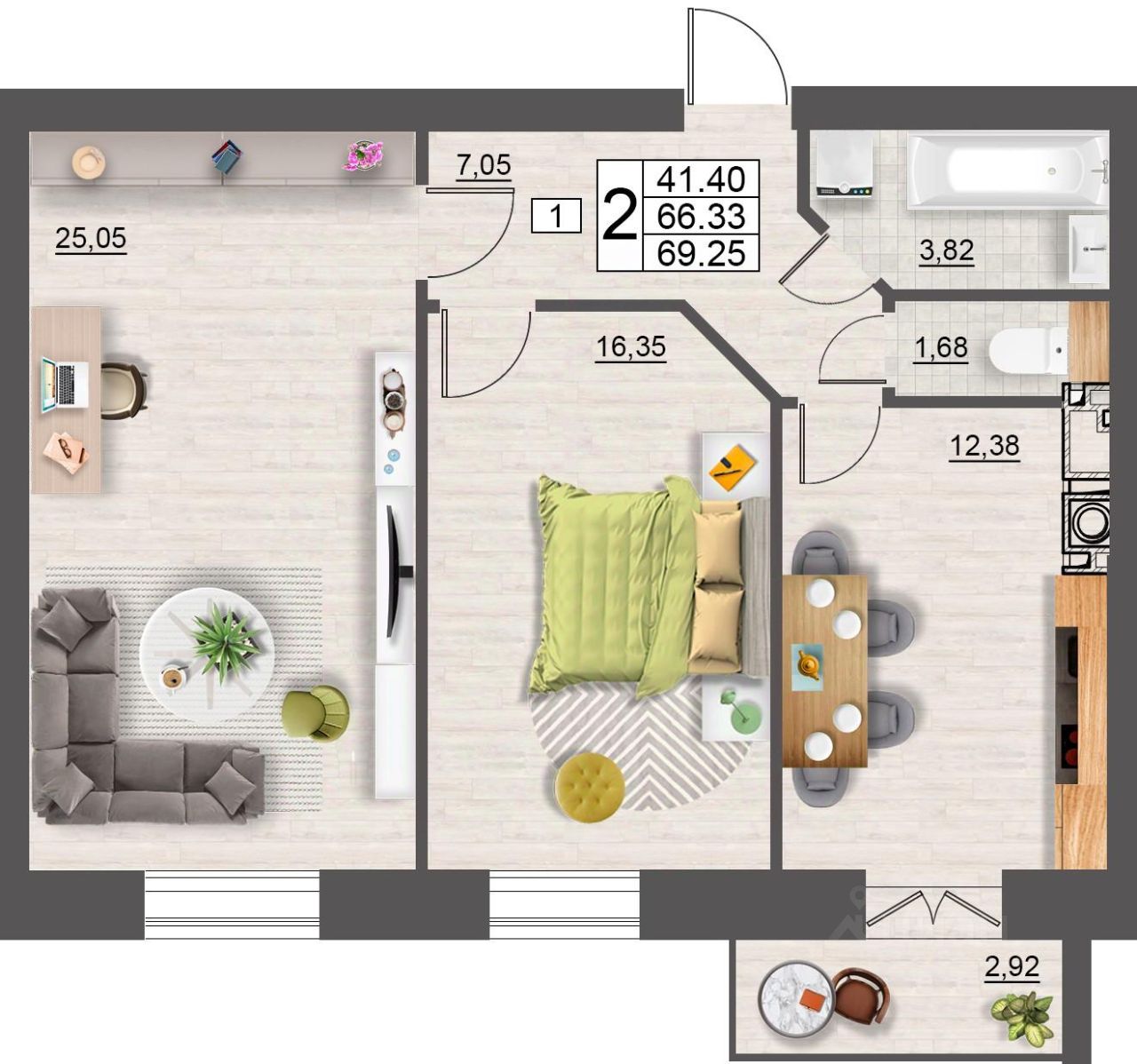 Продаётся 2-комнатная квартира в строящемся доме (дом 5 (секции 1,2)), срок сдачи: II-кв. 2027, общей площадью 69.25 кв.м., на 1 этаже. Расположение, транспортная доступность
