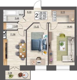 Продаётся 2-комнатная квартира в строящемся доме (дом 5 (секции 1,2)), срок сдачи: II-кв. 2027, общей площадью 60.67 кв.м., на 9 этаже. Расположение, транспортная доступность