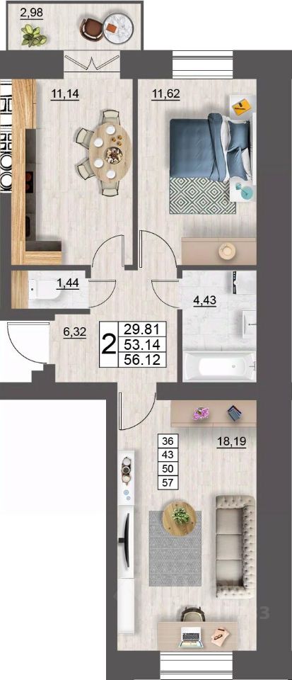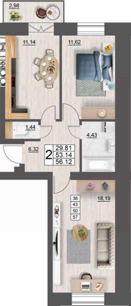 Продаётся 2-комнатная квартира в строящемся доме (дом 5 (секции 1,2)), срок сдачи: II-кв. 2027, общей площадью 56.12 кв.м., на 6 этаже. Расположение, транспортная доступность
