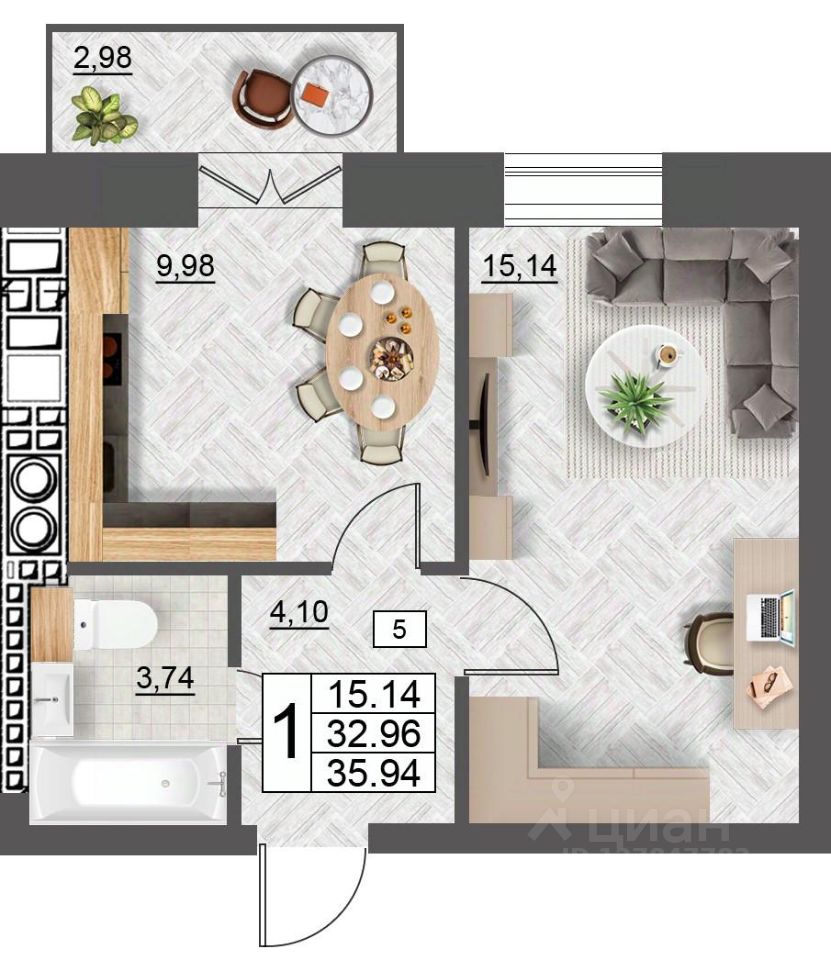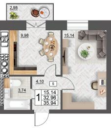 Продаётся 1-комнатная квартира в строящемся доме (дом 5 (секции 1,2)), срок сдачи: II-кв. 2027, общей площадью 35.94 кв.м., на 2 этаже. Расположение, транспортная доступность