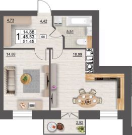 Продаётся 1-комнатная квартира в строящемся доме (дом 5 (секции 1,2)), срок сдачи: II-кв. 2027, общей площадью 51.45 кв.м., на 2 этаже. Расположение, транспортная доступность