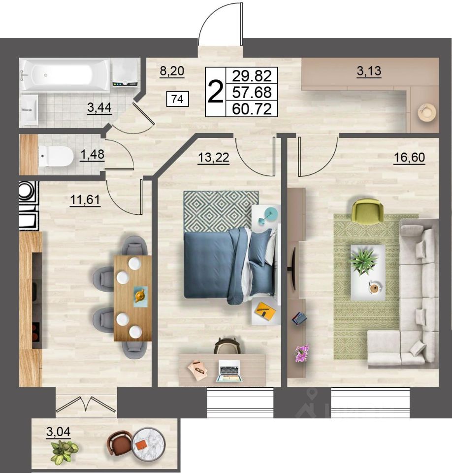 Продаётся 2-комнатная квартира в строящемся доме (дом 5 (секции 1,2)), срок сдачи: II-кв. 2027, общей площадью 60.72 кв.м., на 2 этаже. Расположение, транспортная доступность
