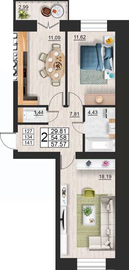 Продаётся 2-комнатная квартира в строящемся доме (дом 9 (секции 3,4)), срок сдачи: II-кв. 2027, общей площадью 57.57 кв.м., на 3 этаже. Расположение, транспортная доступность