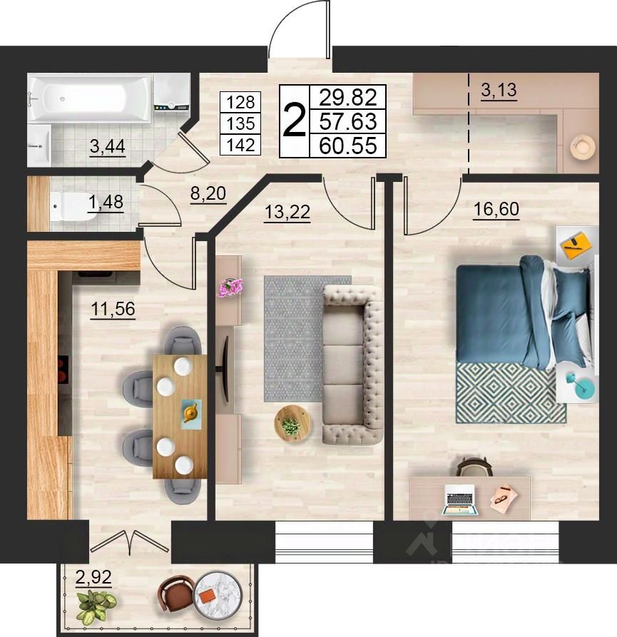 Продаётся 2-комнатная квартира в строящемся доме (дом 9 (секции 3,4)), срок сдачи: II-кв. 2027, общей площадью 60.55 кв.м., на 4 этаже. Расположение, транспортная доступность