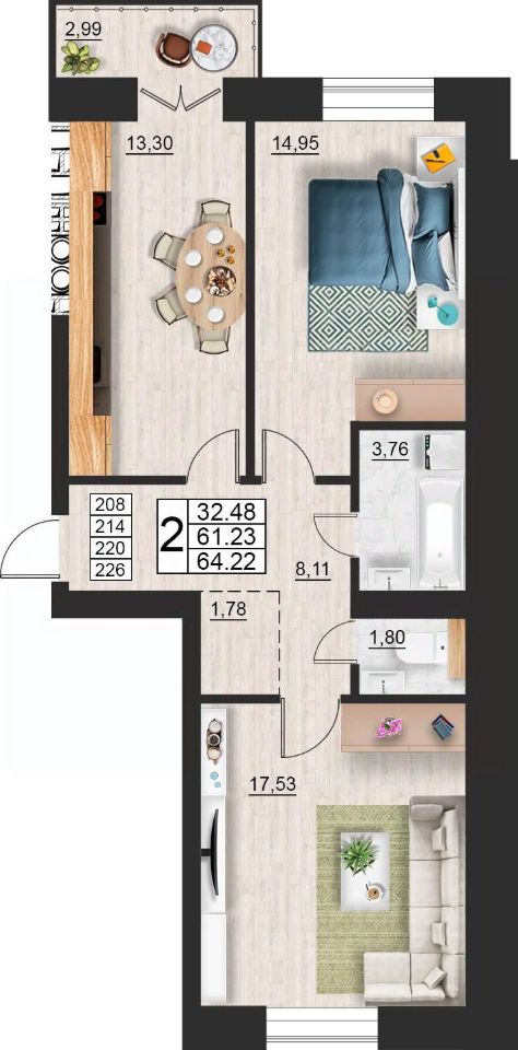 Продаётся 2-комнатная квартира в строящемся доме (дом 9 (секции 3,4)), срок сдачи: II-кв. 2027, общей площадью 64.22 кв.м., на 9 этаже. Расположение, транспортная доступность
