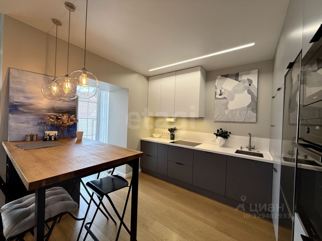 - Оснащена встроенной техникой духовой шкаф Weissgauff, посудомоечная машина, варочная панель, микроволновая печь Weissgauff), вытяжка, большой холодильник Samsung.