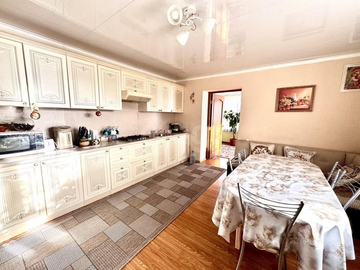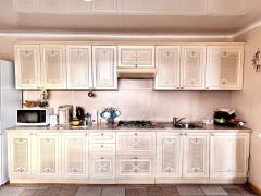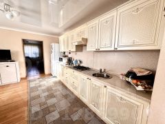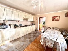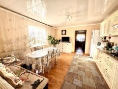 У дома располагается большая беседка-веранда, с неё можно попасть в летнюю кухню, в которой установлен универсальный котёл отопления работающий от различных источников питания (дрова, уголь, электричество, газ). При входе с основного крыльца в дом, мы попадаем в просторную прихожую из которой мы перемещаемся в большую и светлую кухню с обеденным столом, где можно проводить уютные встречи с семьёй и друзьями.