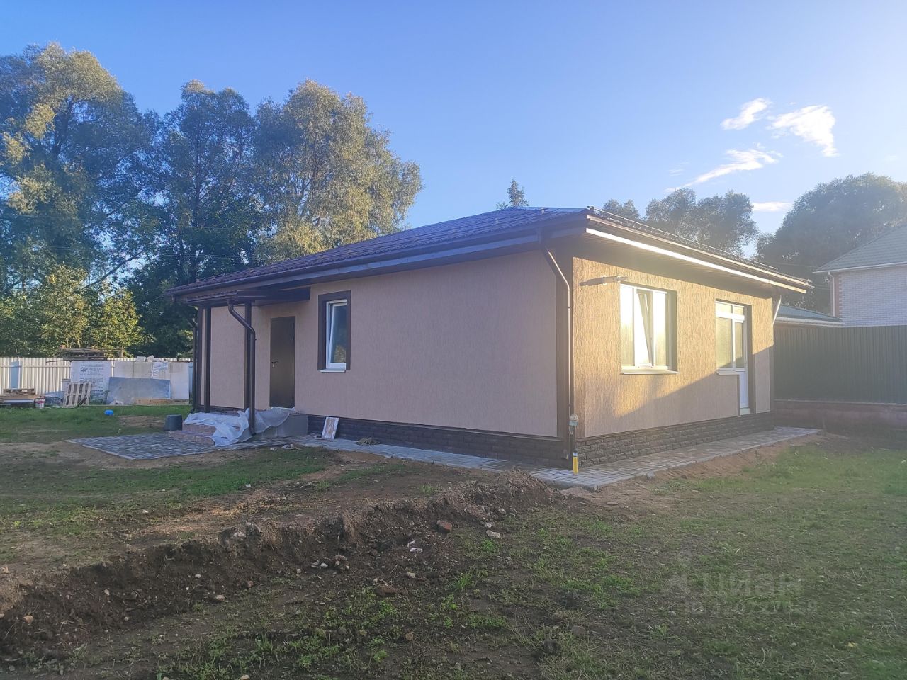 В продаже одноэтажный жилой дом общей площадью 91 м² на земельном участке площадью 8,4 сотки. Он был построен в 2024 году на монолитном ленточном фундаменте из пеноблока. Фасад дома оштукатурен по фасадной сетке и декорирован декоративной штукатуркой Кароед.