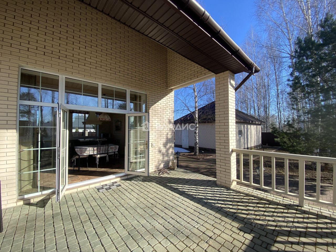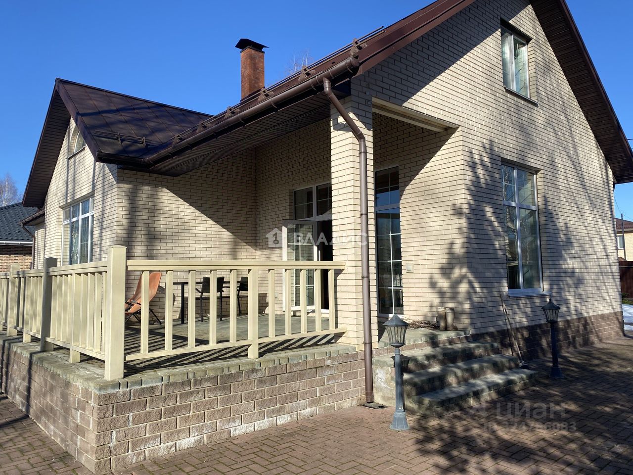 Вокруг дома брусчатка и ухоженный зеленый ландшафт.