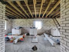 Дом площадью 201 кв метр, построен по проекту с соблюдением технических требований, из смешанного материала: монолитный ленточный фундамент, кирпичный цоколь, стены из газосиликатного 400 блока, облицован декоративным кирпичом, крыша металлочерепица. Установлены пластиковые окна. Сделаны перекрытия второго этажа, на 1м этаже планировка свободная. Потолки высокие 3,2м!!
