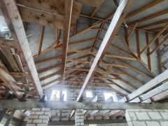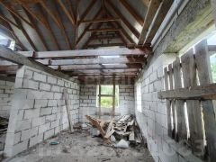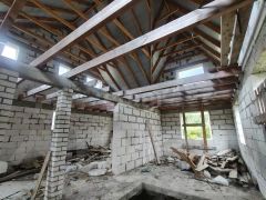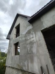 Дом построен из пеноблока, фундамент кирпич, фасад утеплен и оштукатурен. Сделаны перекрытия второго этажа. на половину площади фундамента сделан подвал.