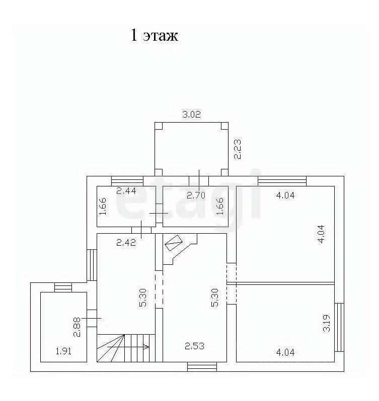 1 этаж: прихожая, кухня-гостиная с камином, две комнаты, совмещенный санузел, есть погреб глубиной 2 м.