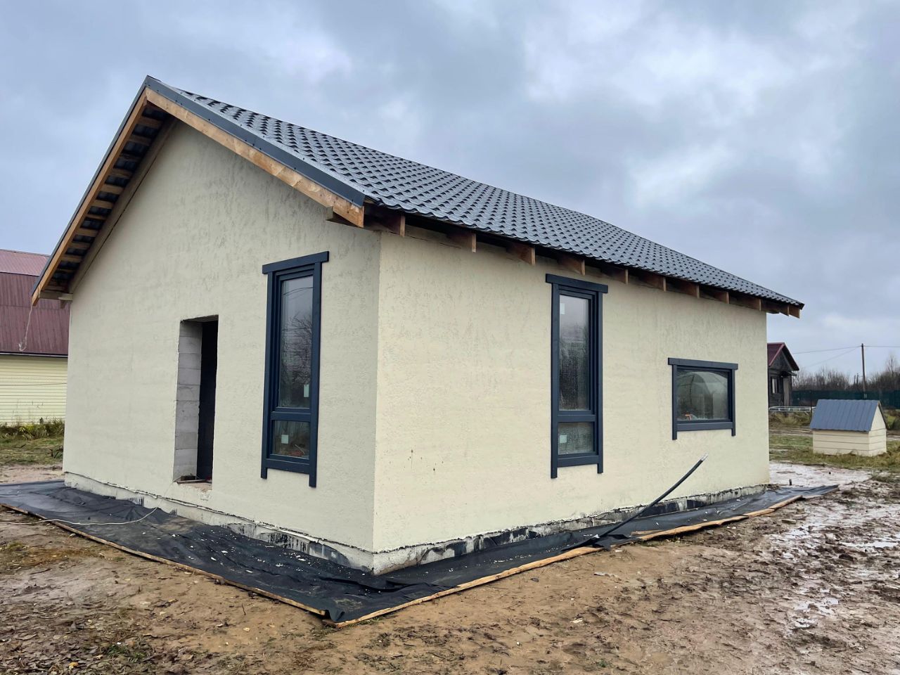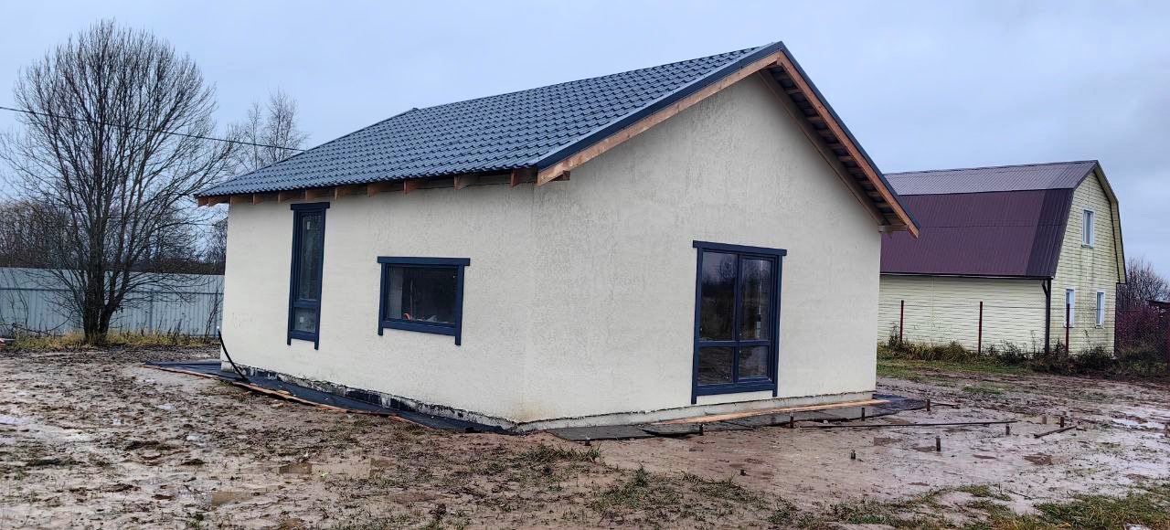 Комплектация дома: коробка пеноблок, фундамент монолитная плита 300мм, кровля металлочерепица цвет графит (стеклопакет 70мм три стекла, цвет снаружи графит, стекло атермальное), снаружи декоративная штукатурка, крата мира, окрашен прорезиненной краской слоновая кость.