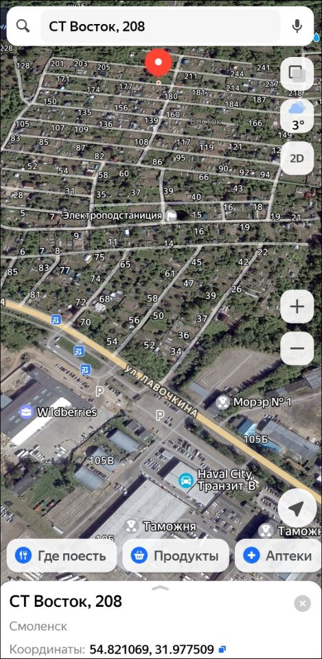 Для осмотра участка в Яндекс картах набрать - СТ Восток 208, или 54.821043, 31.977700