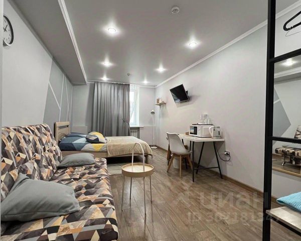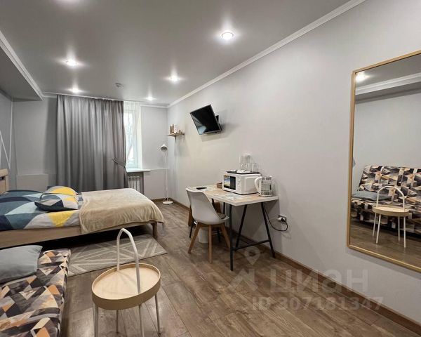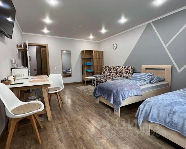 В номере: мини-кухня (микроволновая печь, плита, холодильник, посуда, столовые приборы, чайник), телевизор, вентилятор, обеденный стол, шкаф, вешалки, зеркало, тумба, стул, тапочки, светонепроницаемые шторы.