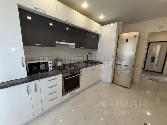Просторная кухня в светлых позитивных тонах полностью оборудована для комфортного проживания.